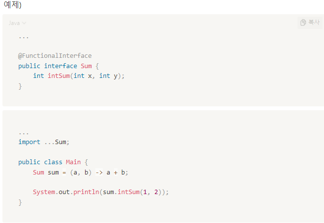 - @FuntionalInterface 애노테이션을 인터페이스에 선언하면 컴파일 시점에서 추상메소드를 하나만 갖는지 체크해 준다.
