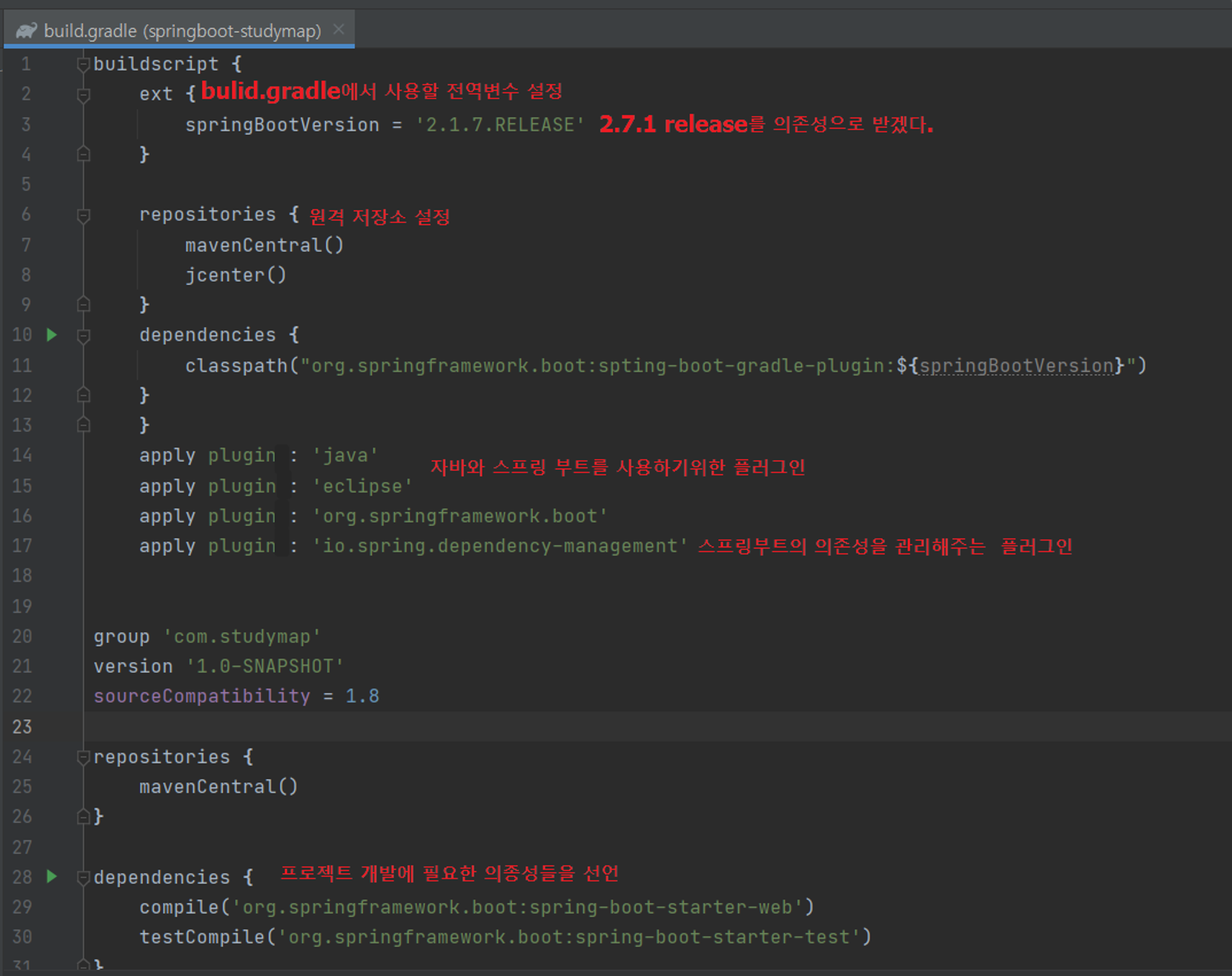 • build.gradle : 의존성이나 플러그인 설정 등과 같은 빌드에 필요한 설정 명시