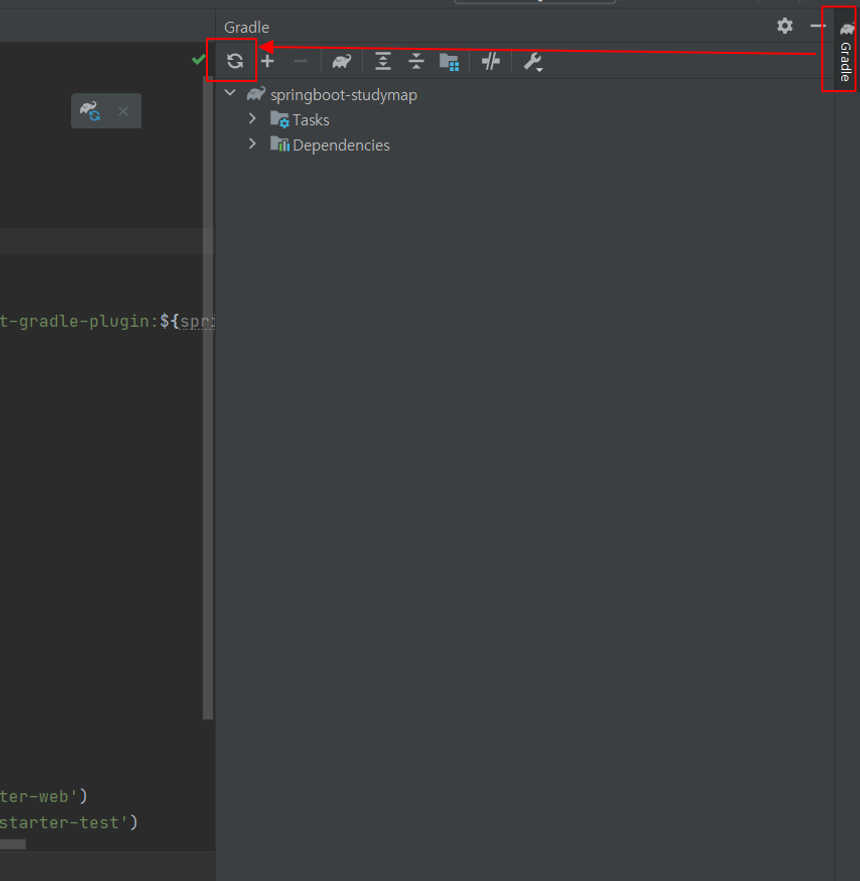 우측 gradle window로 들어가 gradle 새로고침 버튼을 클릭 시 build.gradle