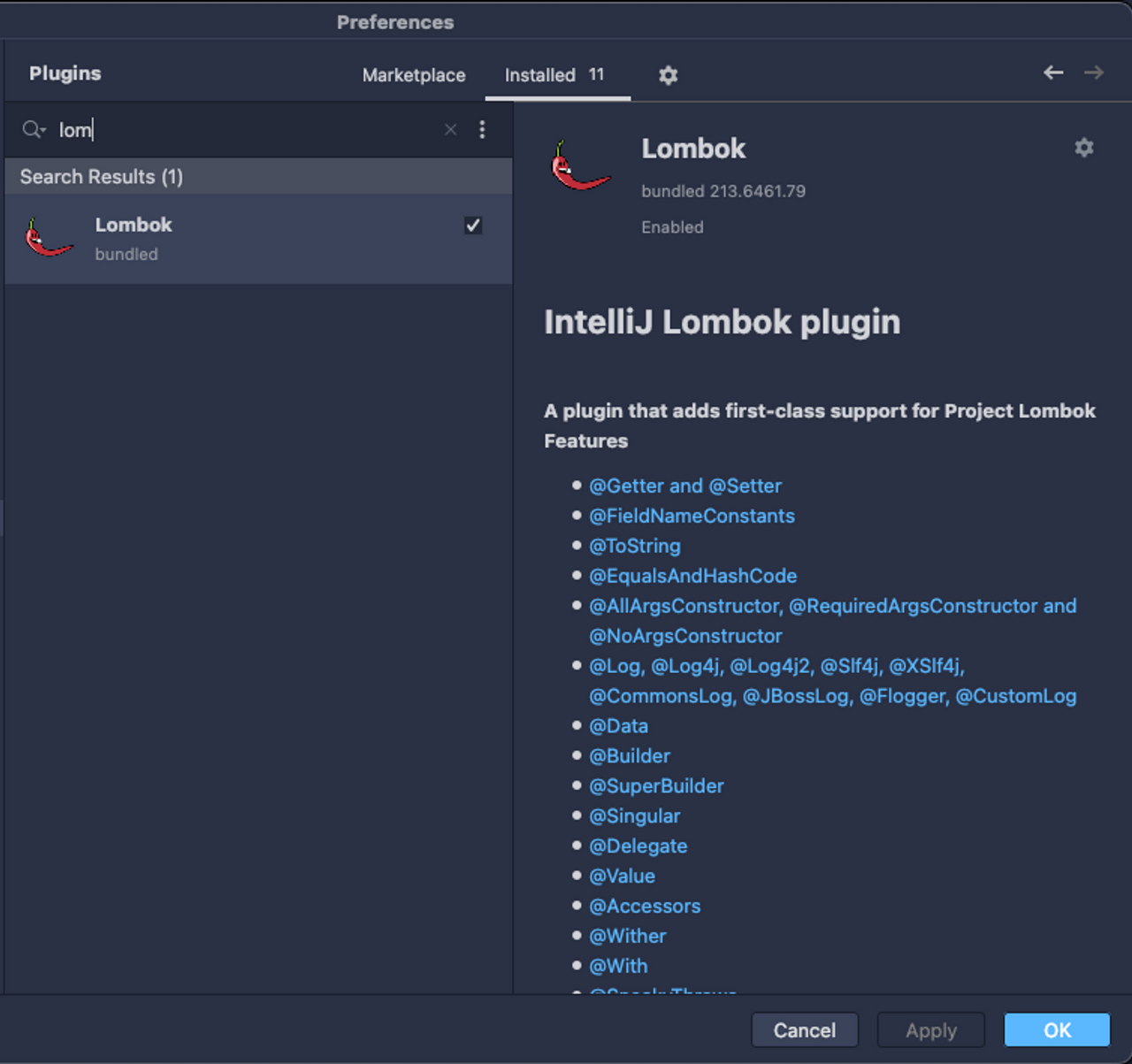 2. Plugins에서 Lombok을 검색한 후 설치합니다.
