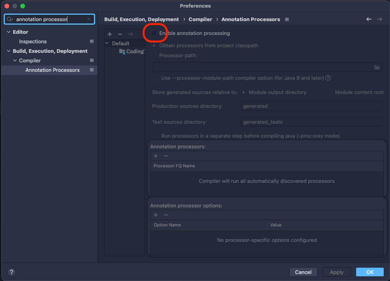 3. Settings > Annotation Processors 검색 후 Enable annotaion processing에 체크해줍니다.