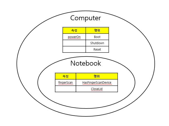 그림과 같이 Computer는 가장 일반적인 개념으로 그 범위는 Computer를 상속받은 Notebook을 포함한다.